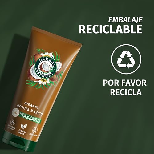 Herbal Essences Acondicionador Hidratante con Aroma a Coco ayuda a hidratar el pelo muy seco, aportando una sensación de equilibrio y transportando tus sentidos gracias a su suave aroma. Al mezclar nutrientes de origen vegetal infusionados con extracto de coco, obtenemos una fórmula vegana que hidrata el pelo seco. Nuestra lujosa y cremosa fórmula se puede usar como acondicionador con aclarado o sin aclarado, para disfrutar esta intensa sensación durante más tiempo.